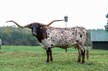 He lost 4" of horn, but he has plenty of horn left as you can see. His weight at 6/11/2016 was 1485 lbs. Not a light weight for sure so we are looking forward to some big bodied, colorful cattle from this guy.Thanks to Joe Sedlacek at Lazy J Longhorns for selling us this bull.